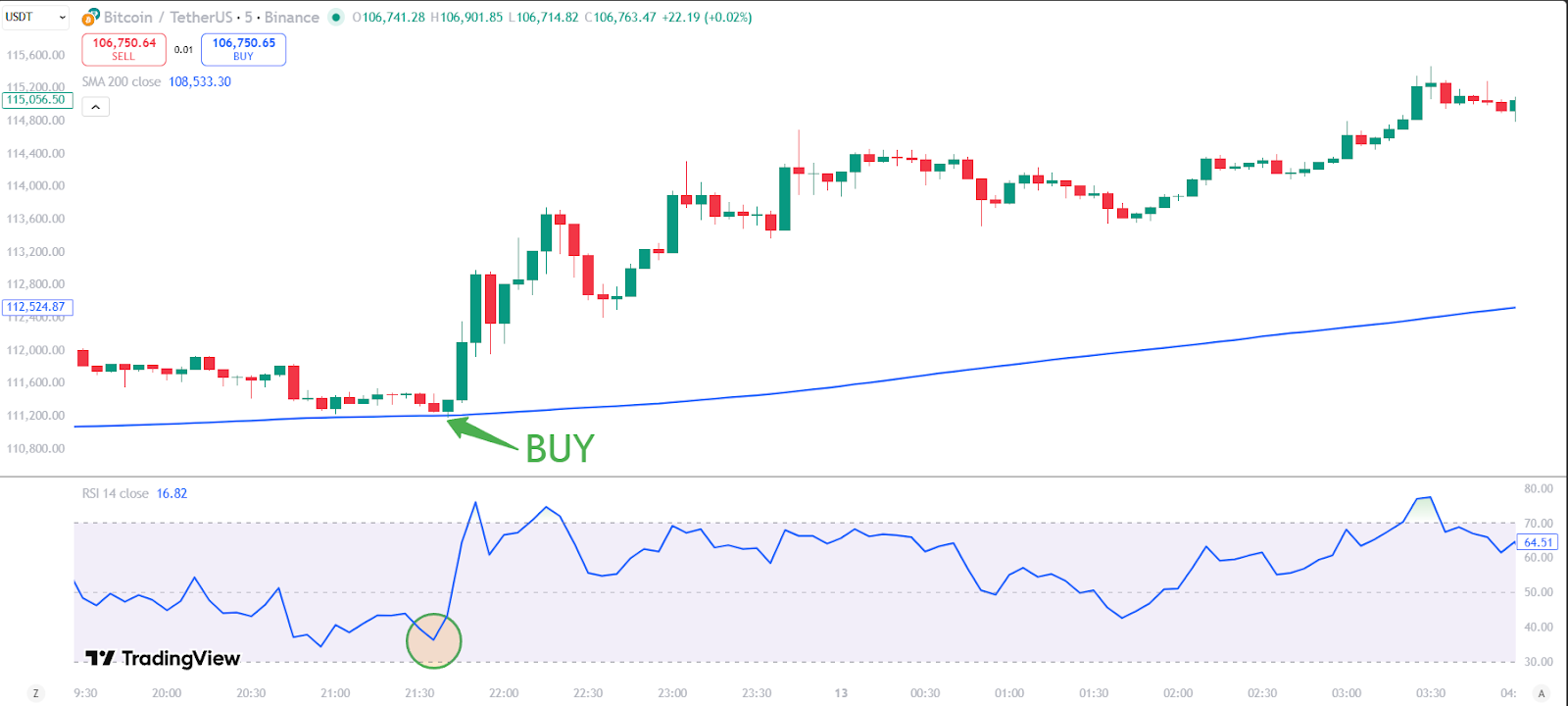 Relative Strength Index becomes even stronger when used with trend filters such as the 200-period Moving Average (MA200). This setup filters noise and focuses only on trades aligned with the main trend.