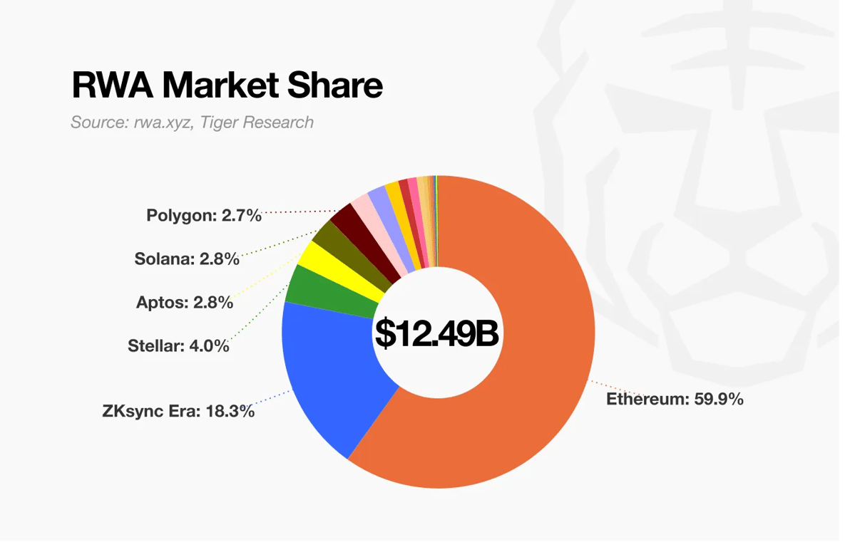 The RWA market structure on Ethereum operates through a three tier ecosystem comprising issuers, platforms, and investors. Ethereum leads with a 52.43% market share, hosting $11.94 billion in tokenized assets by mid 2025, making it a benchmark for institutional RWA tokenization. This structure benefits from Ethereum’s first mover advantage, decentralized architecture, and a comprehensive financial environment where issuance, trading, and settlement occur on chain.