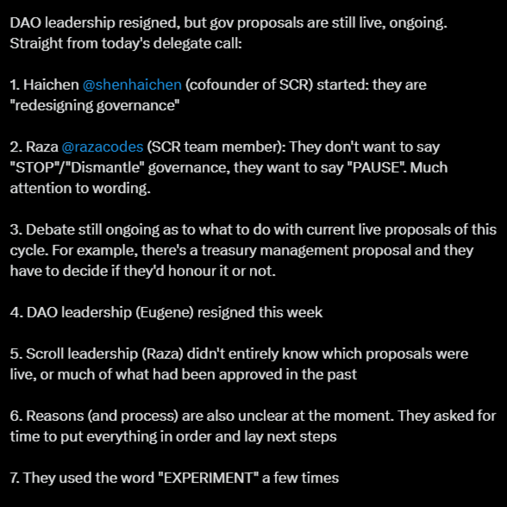 Olimpio revealed on X (formerly Twitter) that Eugene, who led Scroll DAO, formally stepped down earlier this week. Scroll co-founder Haichen Shen added that the team is currently “redesigning governance,” but provided no specific roadmap or timeline.
