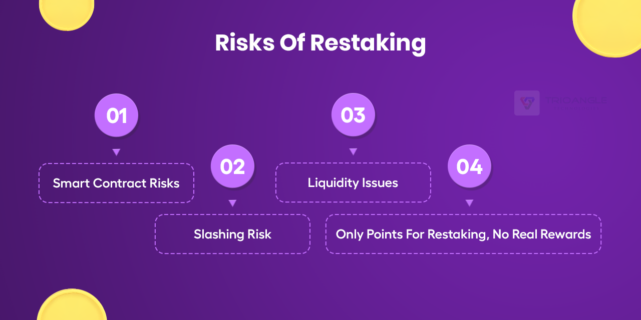 When validators opt into restaking protocols, they accept additional slashing conditions defined by each service on top of the base chain’s own rules. Slashing can result in partial or total loss of staked assets if validators violate protocol rules. The risk increases with each additional service secured, because even honest validators can be slashed due to operational mistakes, misconfigurations, or software bugs in any of the protocols they support.
