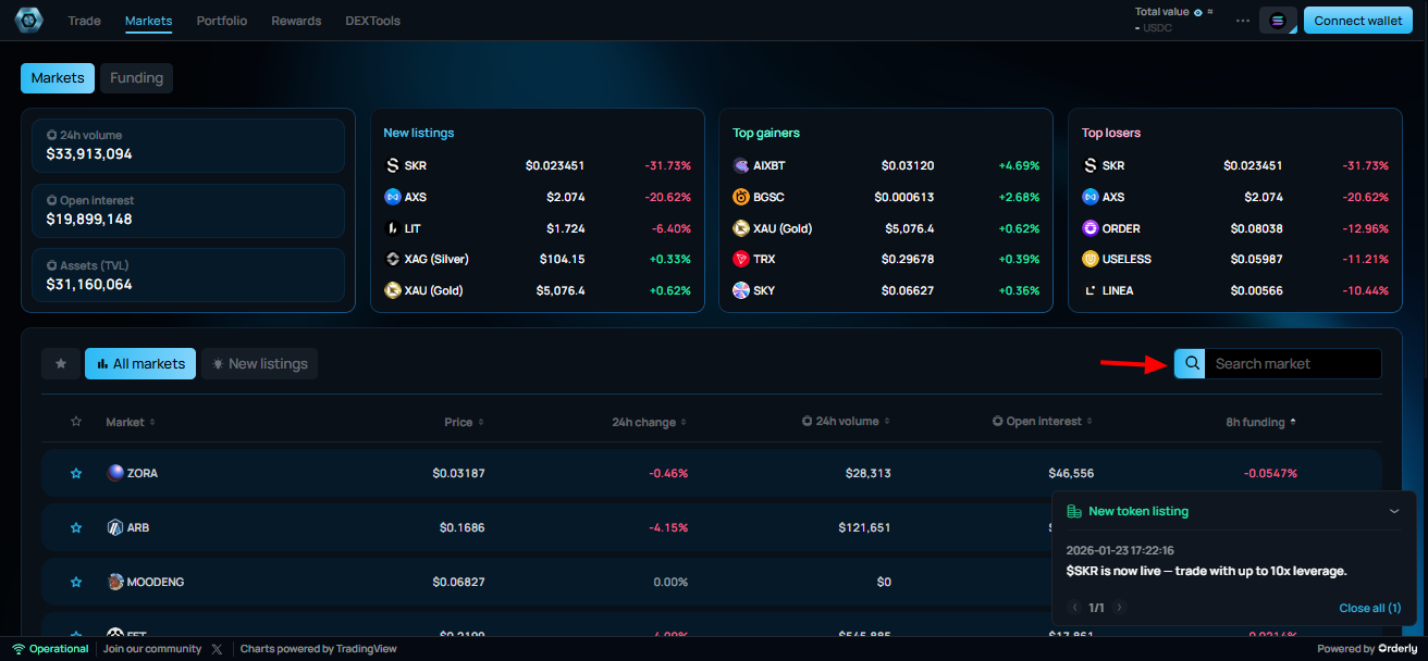 While in the Trading UI, you don't have to go back to the main Markets page to switch assets. Use the Left-Hand Sidebar (Markets list) which features its own search and mini-sorting capability. This allows you to keep an eye on the ETH chart while simultaneously searching for your next setup.