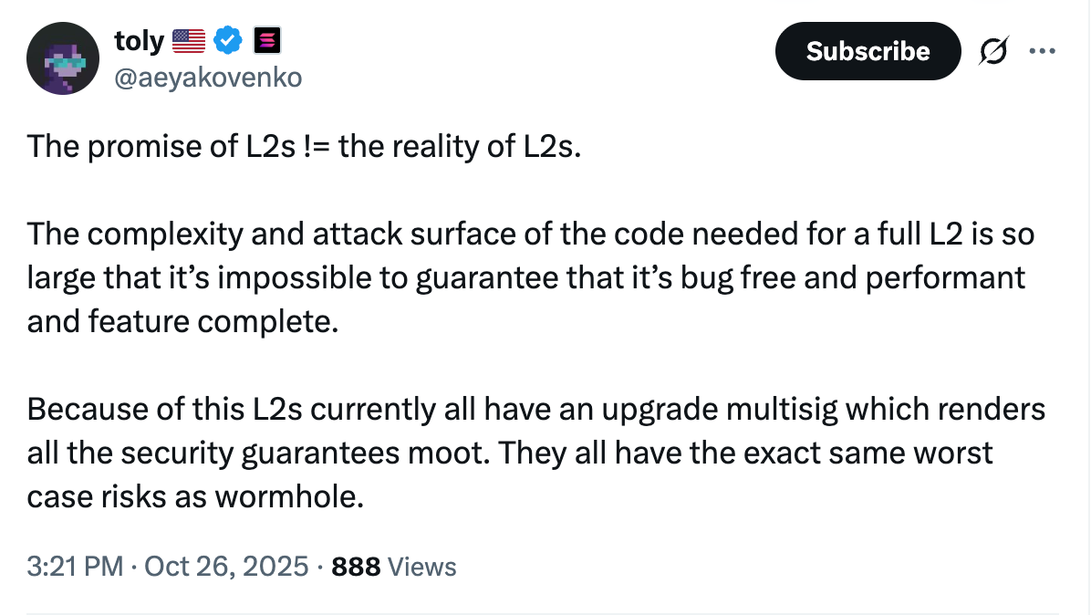 According to Yakovenko, the large codebases of many Ethereum layer-2 solutions make them impossible to audit for vulnerabilities fully. He also emphasized the centralized control present in many L2s — particularly those using multisignature custody setups, which theoretically allow funds to be moved or frozen without user consent.