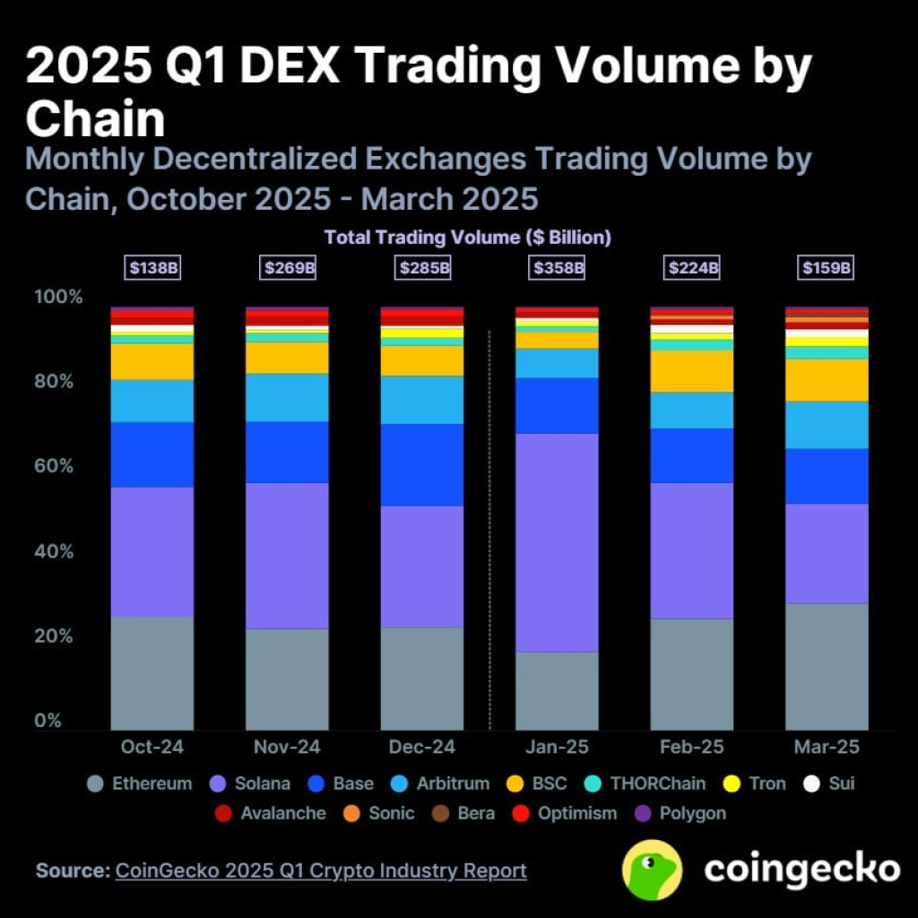 Network revenue, often called “chain GDP,” grew from 971 million USD to 1.2 billion USD in the first quarter of 2025, a 20% gain in three months. Wallet activity followed the same direction, reaching 2.2 million daily users by March, up 60% year on year. April alone generated 107 billion USD in DEX trades, doubling the result from 2024.