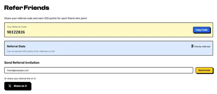 Copy your unique referral code and invitation link to invite other users. Each successful referral earns 200 points. This multiplier effect can significantly accelerate progress toward whitelist qualification and higher tier allocations.