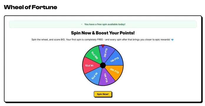Access the “Wheel of Fortune” feature and click “Spin now” to earn bonus points. The project allocates a maximum of 20,000 points daily for the community through this mechanism, distributed on a first-come, first-served basis. Users receive one free spin every 21 hours. An optional “Buy Spins to Keep Going” feature is available at 5 USDC per 10 spins, though participation in this paid option is not required for whitelist eligibility.