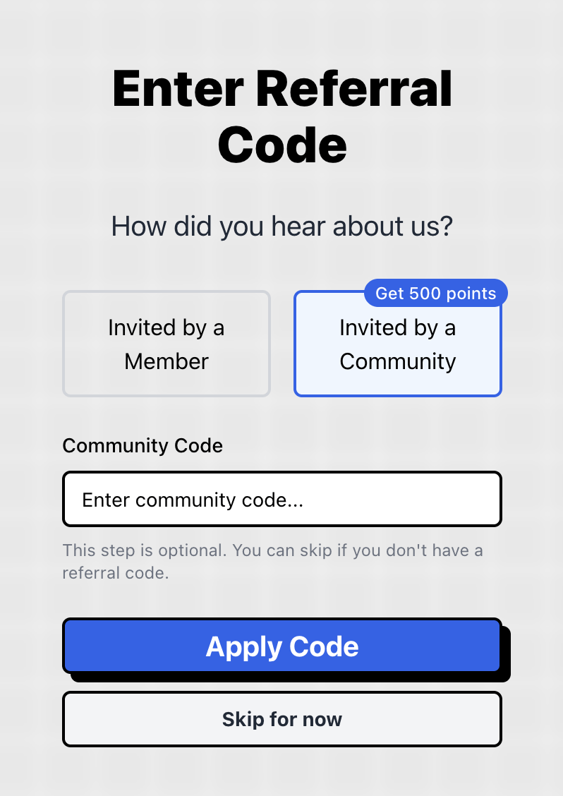 Click “Invited by a Member” and enter referral code 19881CB6 to receive your first 100 points as a welcome bonus.