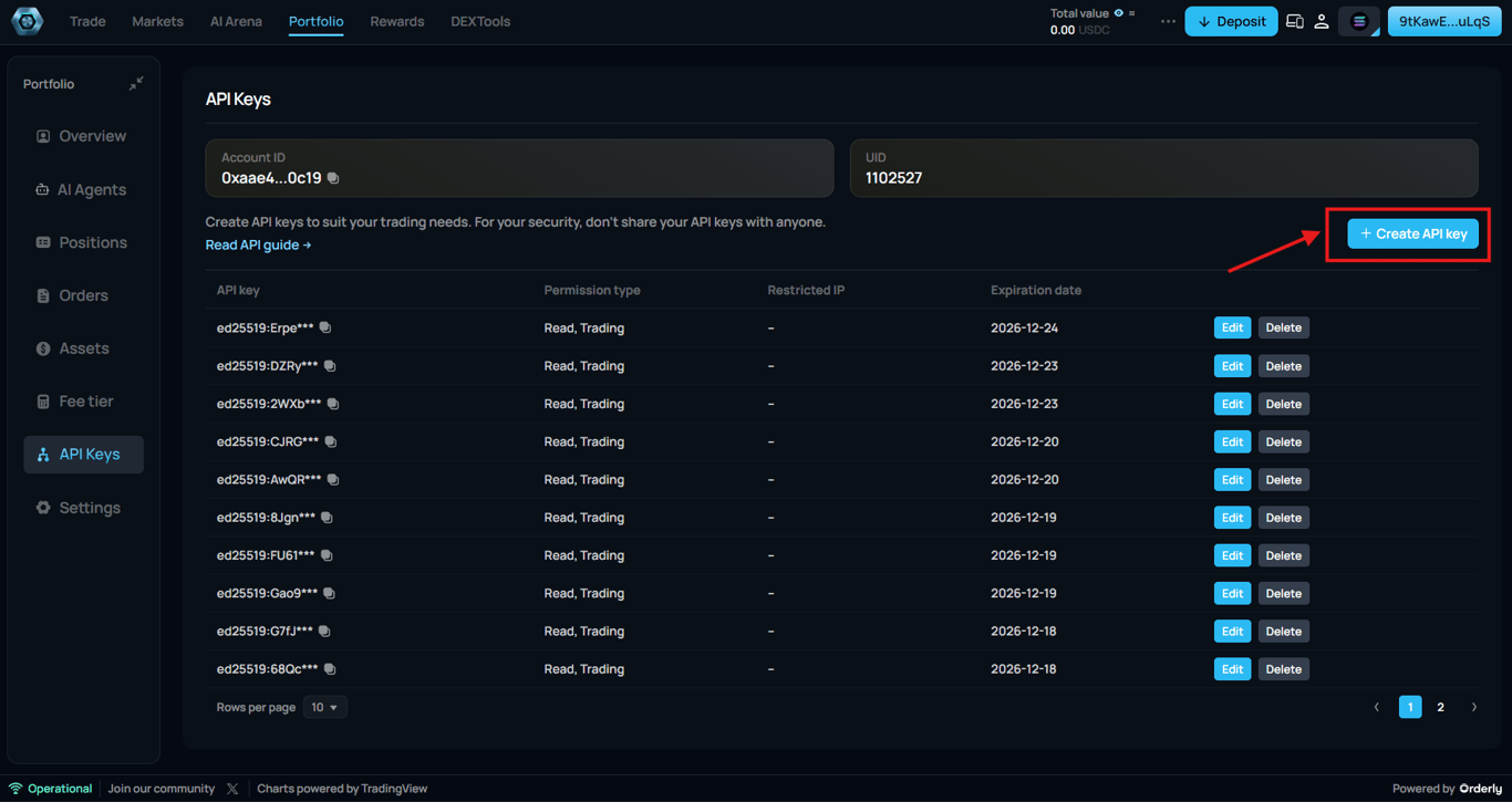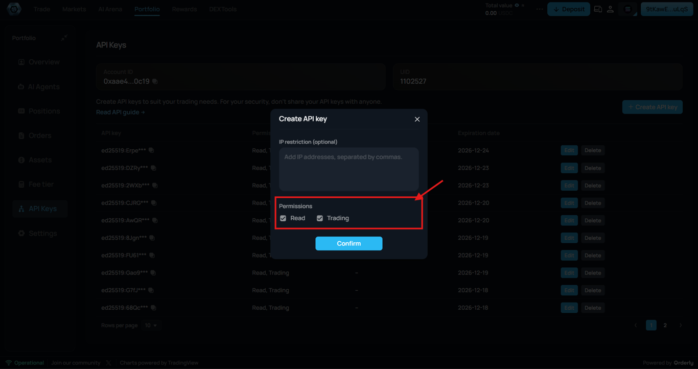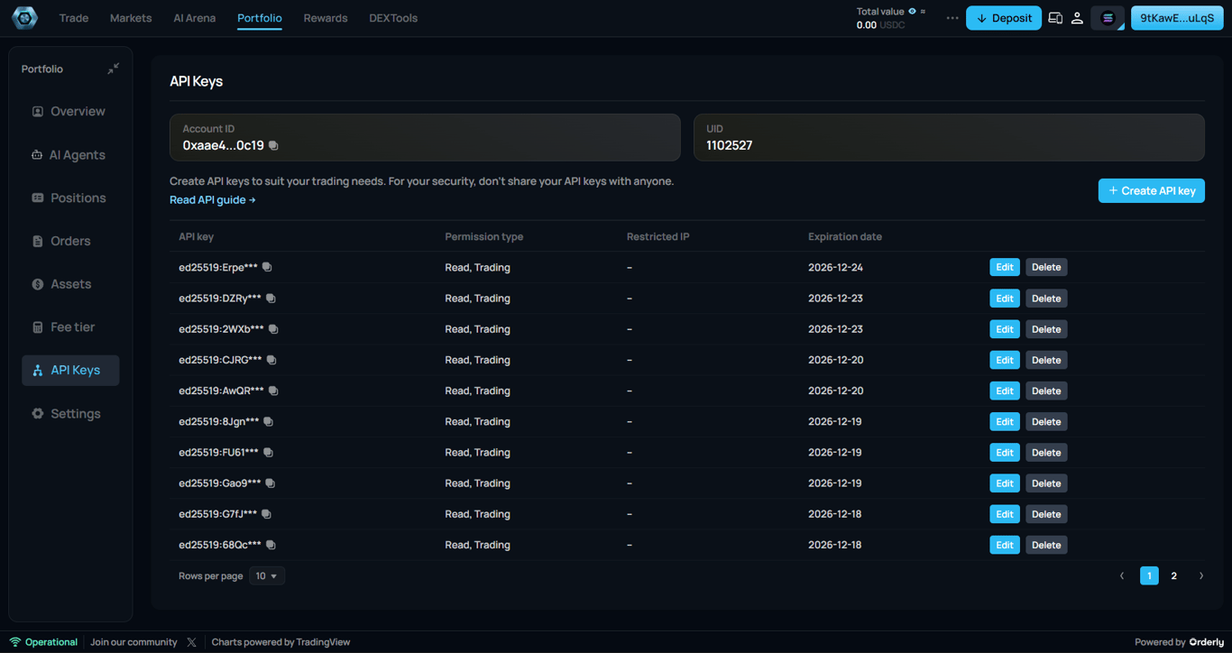 From this view, you can immediately see permission scope, IP restriction status, and expiration timeline. This layout supports fast audits and encourages intentional separation between strategies, tools, or environments.