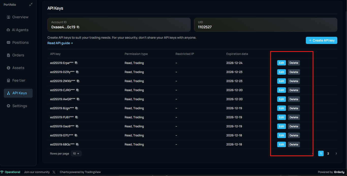 At the top, the interface displays Account ID and UID. These identifiers link every API request to the correct trading account. Below, the API Key list shows all active keys, along with their current status. Each row represents a single access channel, designed for one system or one strategy.