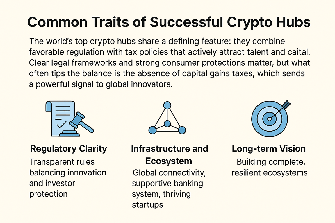 The world’s top crypto hubs share a defining feature: they combine favorable regulation with tax policies that actively attract talent and capital. Clear legal frameworks and strong consumer protections matter, but what often tips the balance is the absence of capital gains taxes, which sends a powerful signal to global innovators.