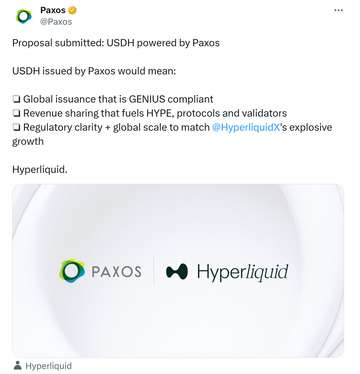 Paxos has unveiled a plan to introduce USDH, a stablecoin designed specifically for the Hyperliquid ecosystem. The token would fully comply with both the U.S. GENIUS Act and the EU’s MiCA regulations.