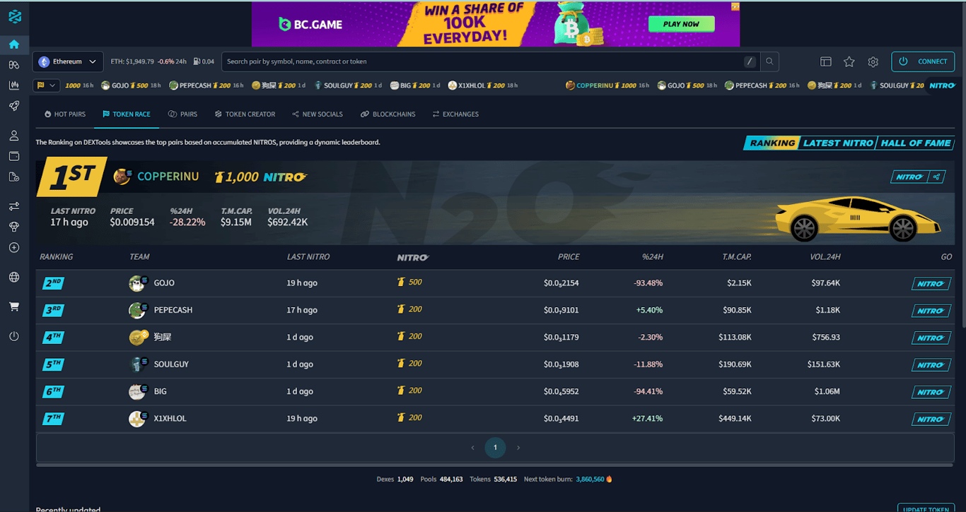 Token Race creates the first visibility shock in meme markets because it concentrates attention into a single competitive surface. As a token climbs the leaderboard and Nitro builds, exposure expands quickly inside DEXTools, so wallets enter earlier and swaps cluster faster than they would through social feeds alone. Swap frequency rises, holder count grows, and price reacts sharply because near-spot depth still stays light during ignition. In this phase, ranking pressure drives participation, and participation drives the first liquidity response.