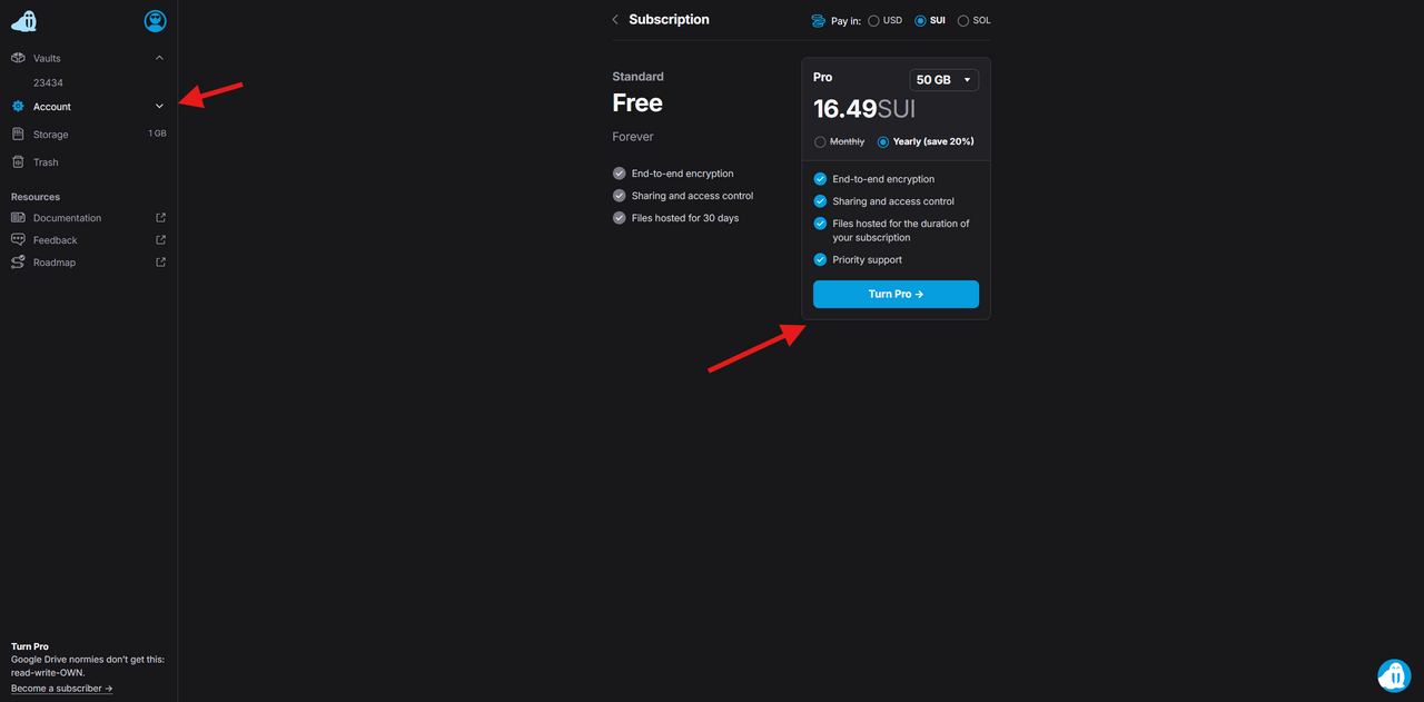 Step 5 – Upgrade Service Plan (Optional): Users can subscribe to monthly or annual paid plans to expand storage to 50 GB and access additional advanced features. Using paid plans may influence the distribution criteria for rewards in future airdrop programs.