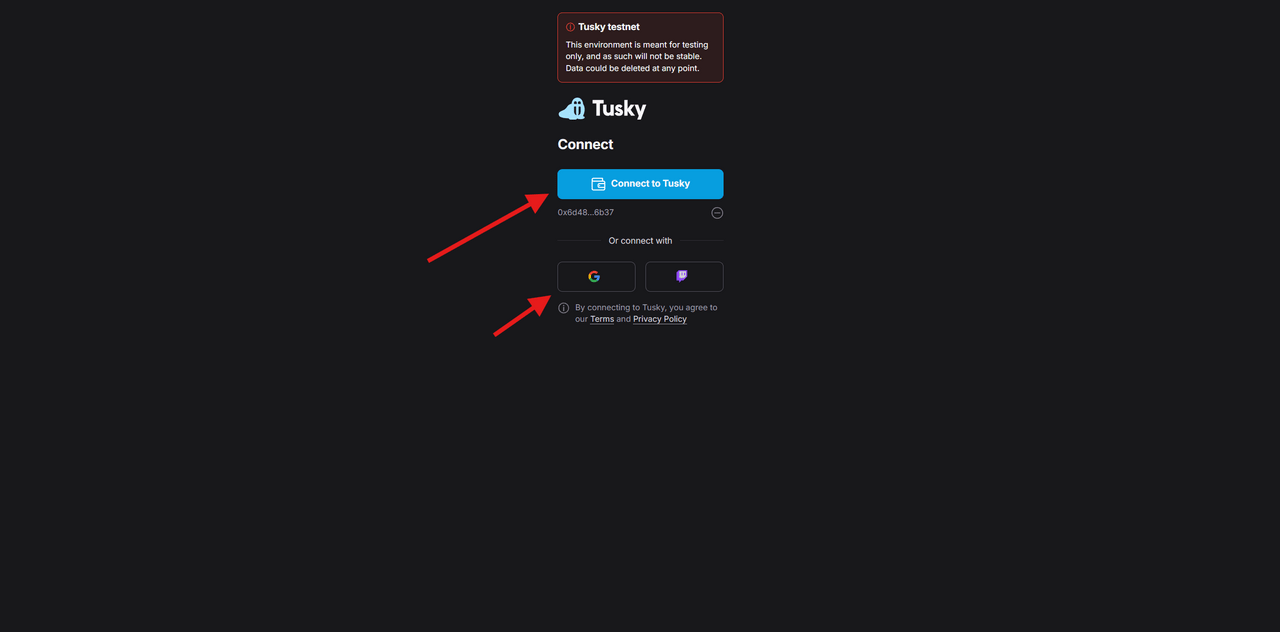 Step 1 – Connect Wallet: Access Tusky's official website and connect a Sui wallet. The platform also supports login through Google or Twitch.