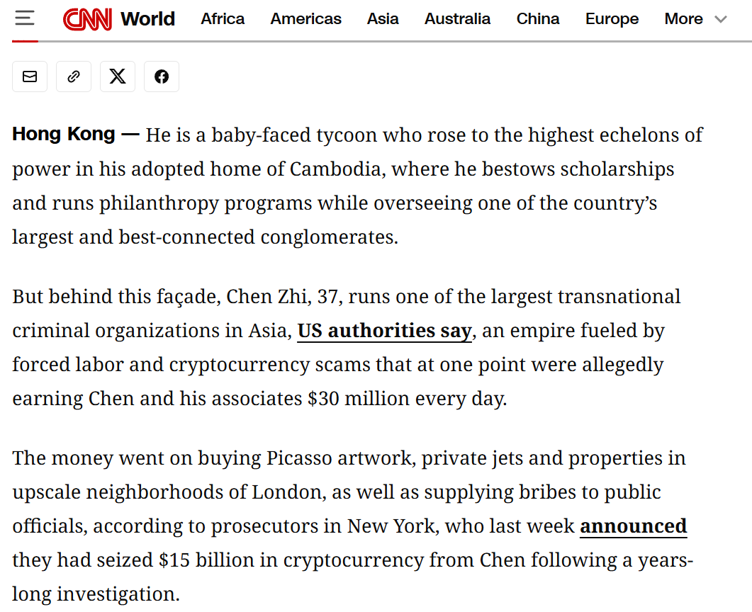 CNN reported in detail on the Chen Zhi case from a law enforcement perspective on October 14, 2025, before China’s accusations emerged. Christopher Raia, FBI Deputy Director, described it as “one of the largest pig butchering schemes they’ve investigated.” CNN reported that Chen and others “are accused of running at least 10 forced labor camps across Cambodia since 2015,” and the $15 billion seizure “far exceeds the $225 million seizure the Justice Department announced in June.” However, CNN and other mainstream US media like Wall Street Journal, Financial Times, Reuters, Associated Press, and New York Times had no specific articles about China’s November 2025 accusations – possibly because the story is very recent or traditional papers are cautious about accusations from the Chinese government.