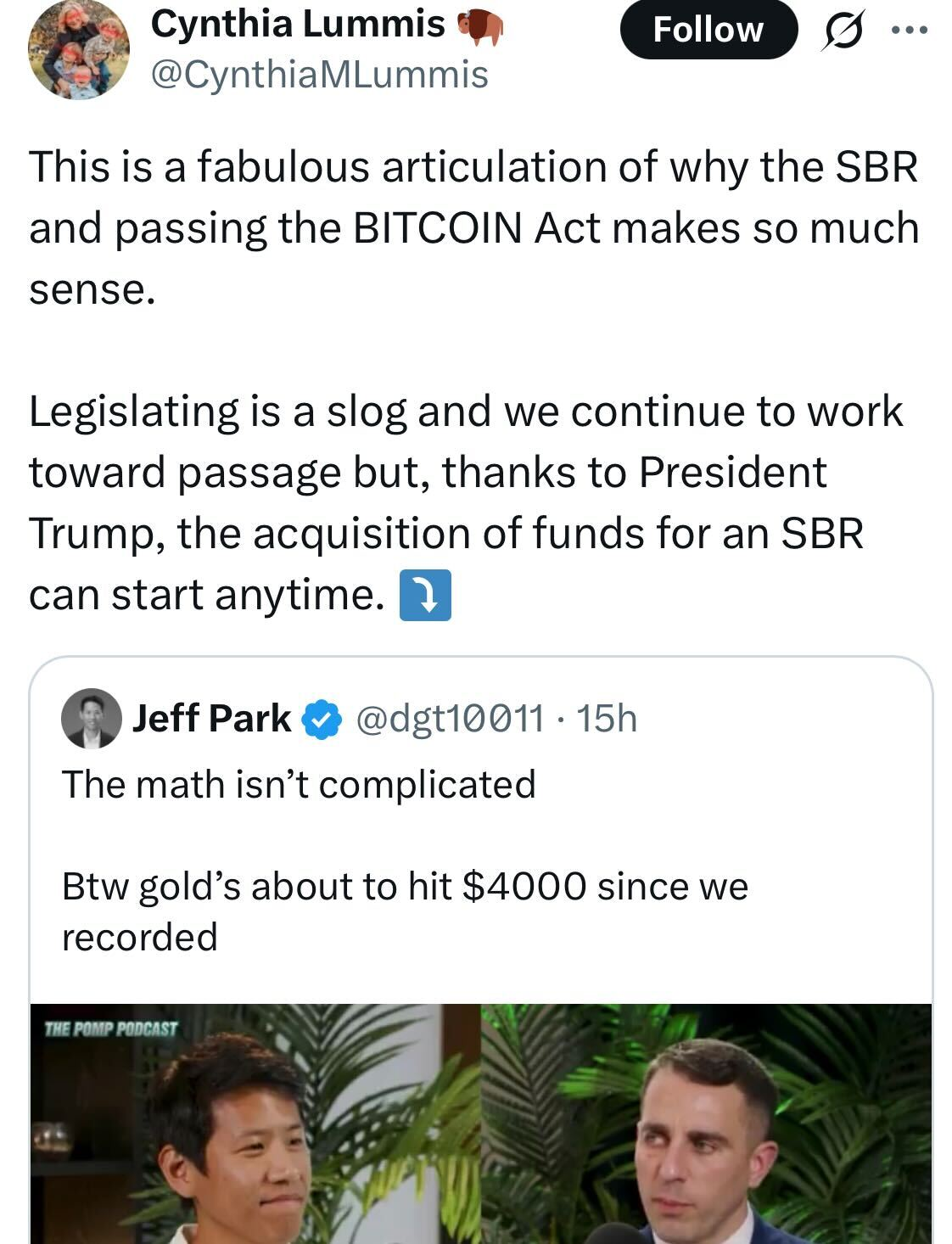 Lummis endorsed the idea, calling it “a fabulous articulation” of why both the Strategic Bitcoin Reserve and the BITCOIN Act make economic sense. The senator has been one of Washington’s strongest Bitcoin supporters, arguing that the US should hold BTC as a long-term strategic asset.