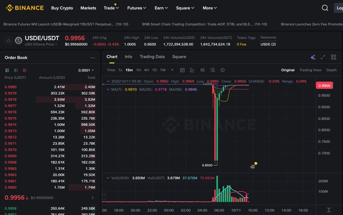 The decisive moment for USDe unfolded on October 10, 2025, when intense volatility tested every element of its structure. Within forty minutes, over $19 billion in open interest vanished across exchanges. On Binance, USDe touched $0.65 before returning to parity, a brief but unforgettable signal of how fragile synthetic balance can become under stress.