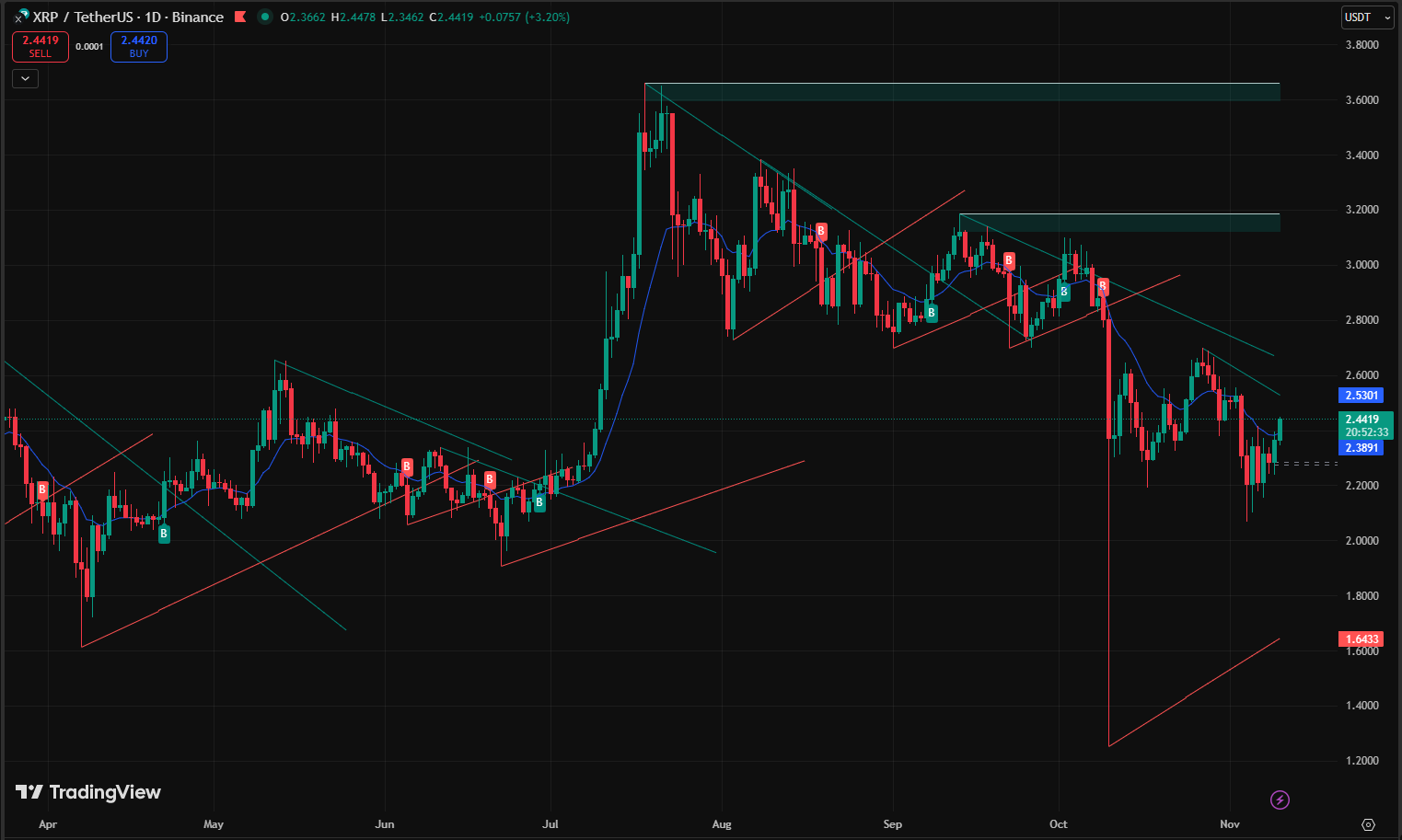 XRP is trading inside a descending triangle pattern that shows a series of lower highs and a flat support zone between 2.30 and 2.50 dollars. This pattern usually signals a continuation of weakness, but if the price breaks above 2.50 with strong volume, it could mark the start of a sharp rebound.