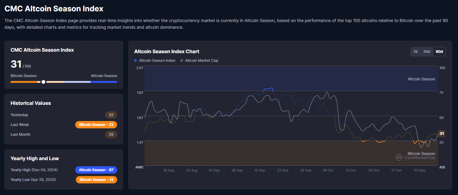 The CMC Altcoin Season Index at 31/100 (Image 3: Altcoin Season Index chart at 31, historical: yesterday 32, last week 22, last month 35) signals Bitcoin season dominance, down from last week 40, month 50. Alt cap contracts, historical lows often precede rebounds if BTC tops.