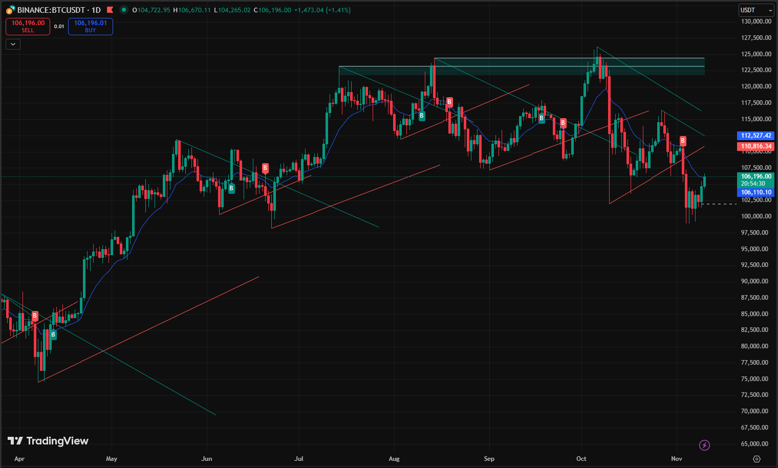 Recent rebounds near 106,000 have marked buy zones, while short-term peaks are viewed as profit-taking points. Volume on rebounds has been fading, which signals caution among traders despite the price recovery.