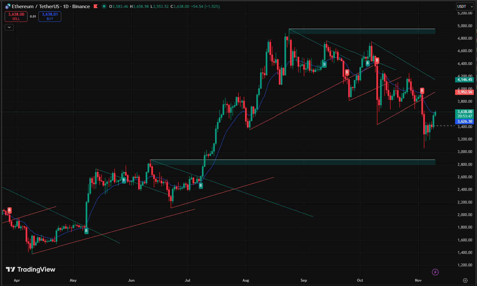• Ethereum (ETH) ended at 3,628.87 dollars (4.09% daily, 5.8% weekly), holding steady within its broader uptrend.