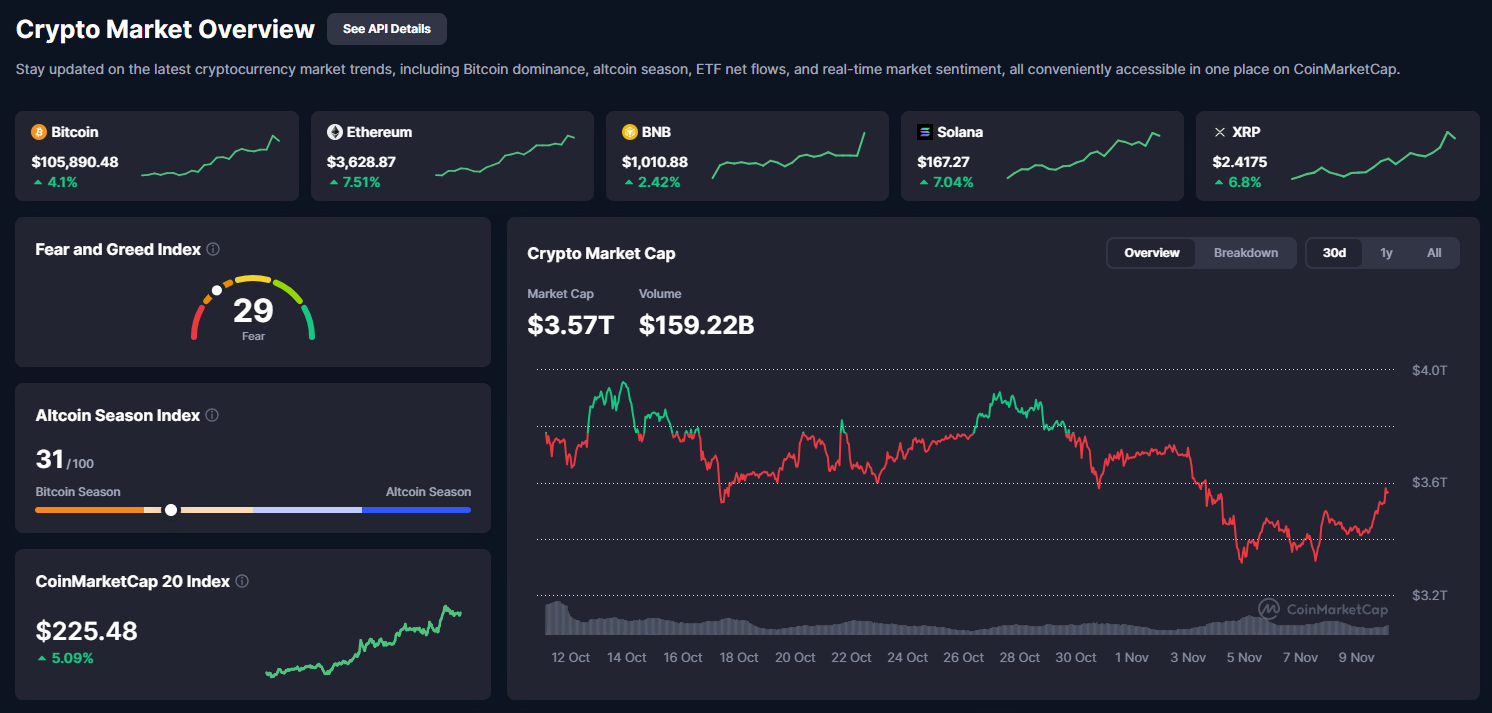From the CoinMarketCap overview (Image 1: Crypto Market Overview dashboard displaying total cap at $3.57T, volume $159.22B, Fear & Greed at 29, Altcoin Season Index at 31, and CoinMarketCap 20 Index at $225.48 -2.81%), the decline is evident: cap line trends downward from late-October levels, with volume spikes on sell-offs.