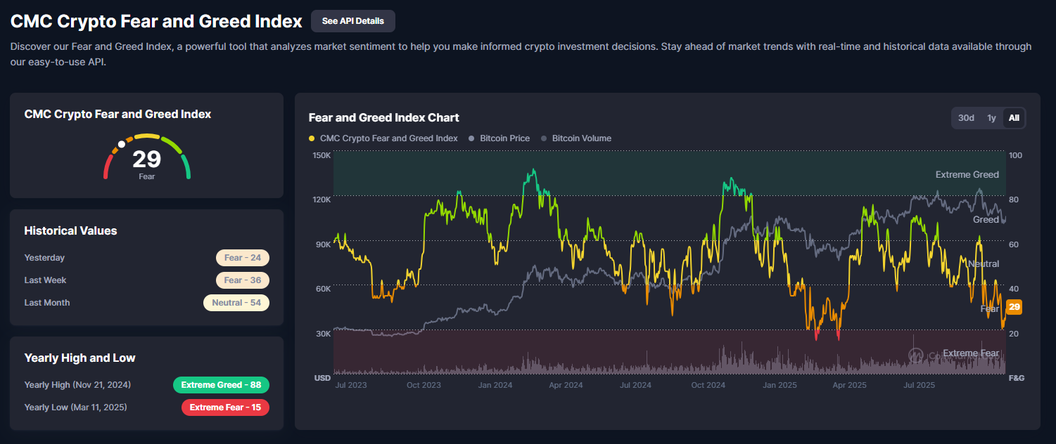 The CMC Crypto Fear and Greed Index at 29 (Fear) (Image 2: Fear and Greed Index chart with current 29, historical: yesterday 24, last week 36, last month 54) captures sentiment drop, BTC overlay downtrends. Yesterday’s 35, last week’s 42, month’s 57 show volatility. Yearly highs 88 lows 15 frame fear as buy signal, components volatility +15%, social -10%. Past Fear Octobers +20% moves.