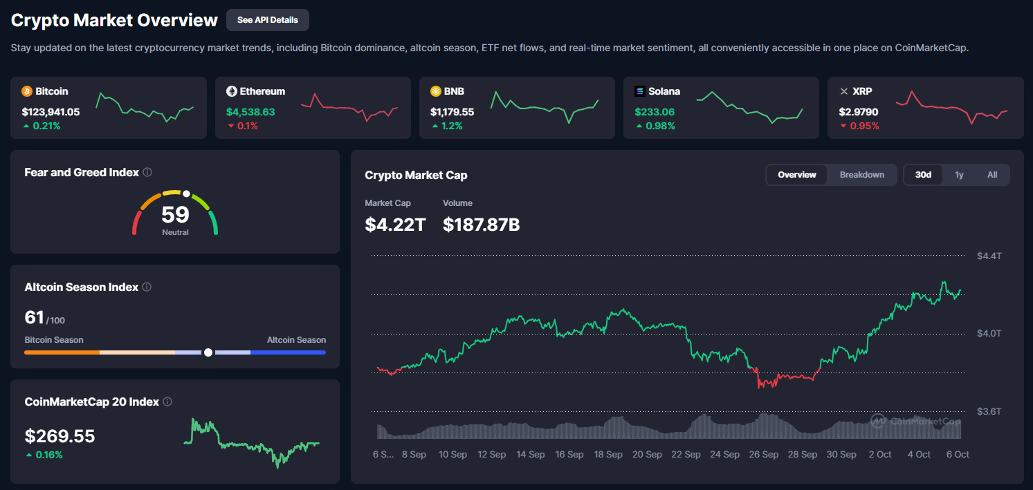 From the CoinMarketCap overview (Image 1: Total cap $4.22T, volume $187.87B, Fear & Greed 59, Altcoin Index 61), the rally is clear. Market cap surged past $4.2T with volume confirmation, showing strong conviction.