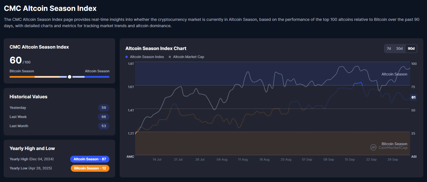 The CMC Altcoin Season Index is now at 60 out of 100, confirming the ongoing strength of altcoins. The chart (Image 3) shows yesterday at 59, last week at 66, and last month at 53, indicating steady resilience despite a slight pullback from last week’s peak. The rise in altcoin market capitalization, driven by Solana and BNB, reinforces this momentum. Historically, when the index moves above 60, rallies tend to extend for several weeks, mirroring the strong performances seen in the 2021 cycle.