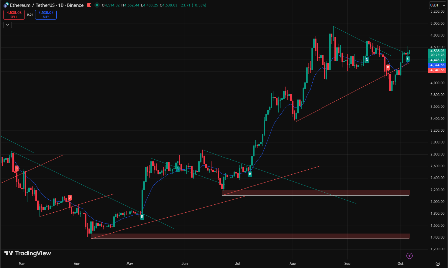 For Ethereum (ETH/USDT on Binance, Image 5), the daily chart shows the price at $4,538.03, down 0.33 percent, continuing its steady climb within an established uptrend channel. ETH remains well supported above $4,400 after the Fusaka upgrade, with the rising trendline from $3,800 still intact. The 50-day moving average at $4,450 provides reliable support, while the price action forms an ascending triangle — buy zones near $4,400 and profit-taking around recent highs.
