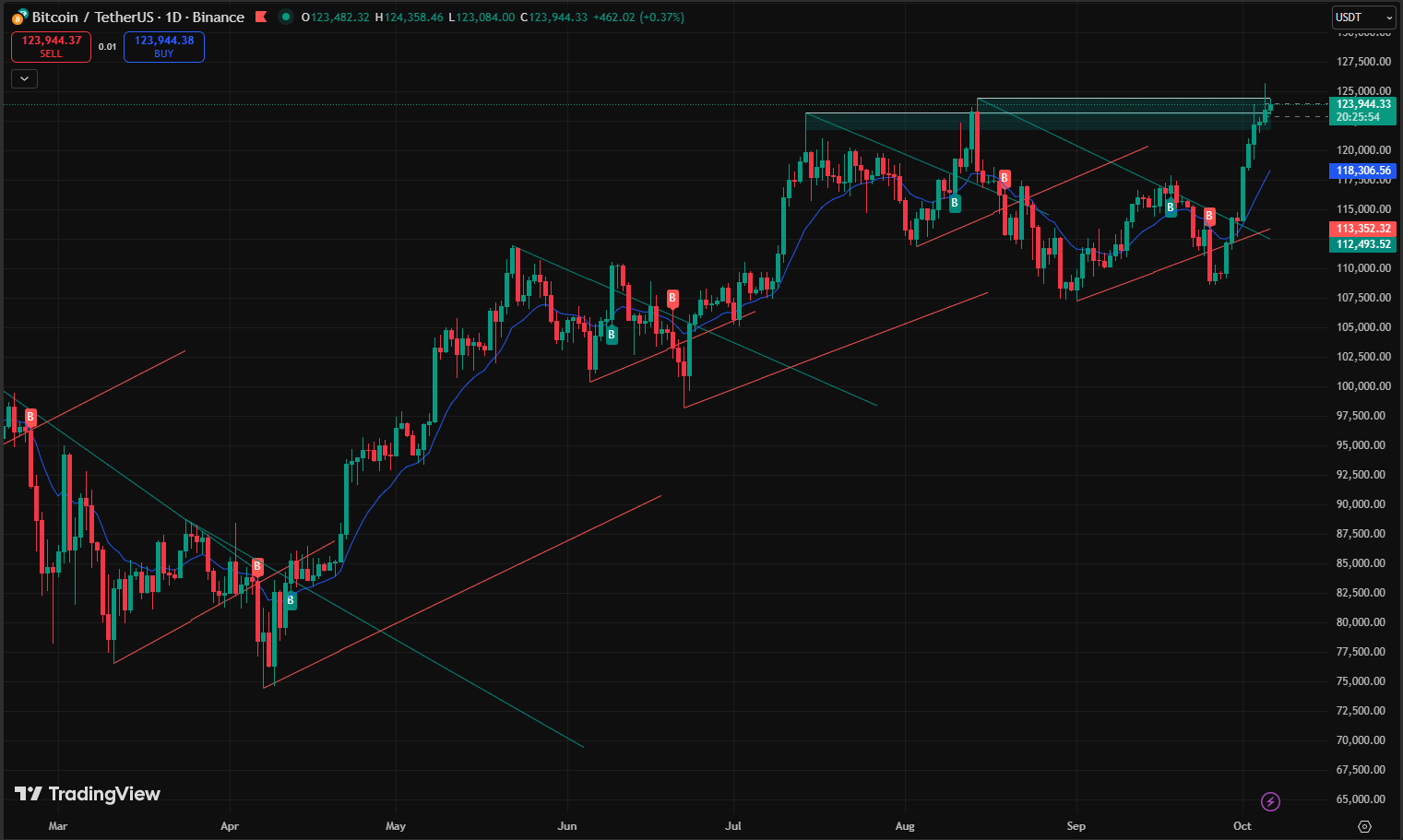 For Bitcoin (BTC/USDT on Binance, Image 4), currently trading at $123,482.32, up 0.37 percent, the setup remains firmly bullish. The daily chart shows a strong ascending channel that began in February 2025, with support at $115,000 holding through multiple retests. The price continues to form higher highs from July’s $96,000, staying well above the 50-day moving average at $118,000, which now acts as a dynamic support following the recent all-time high of $125,500.