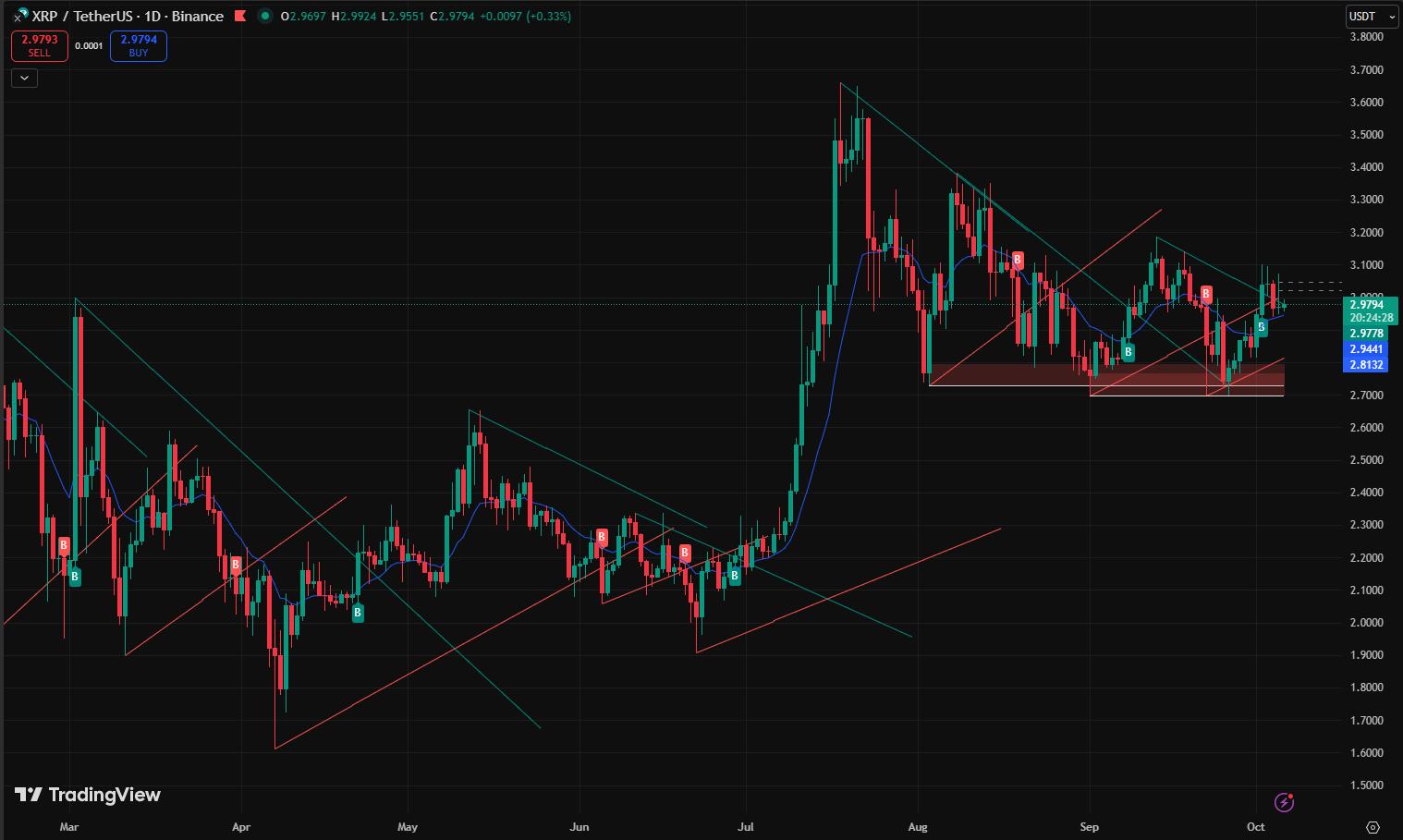 XRP (XRP/USDT on Binance, Image 7: Daily chart at $2.9697 -0.33%, descending triangle breakout). XRP nears $3.00 resistance, $2.80 support, RSI 52 neutral, volume rising. ODL $1.4B.