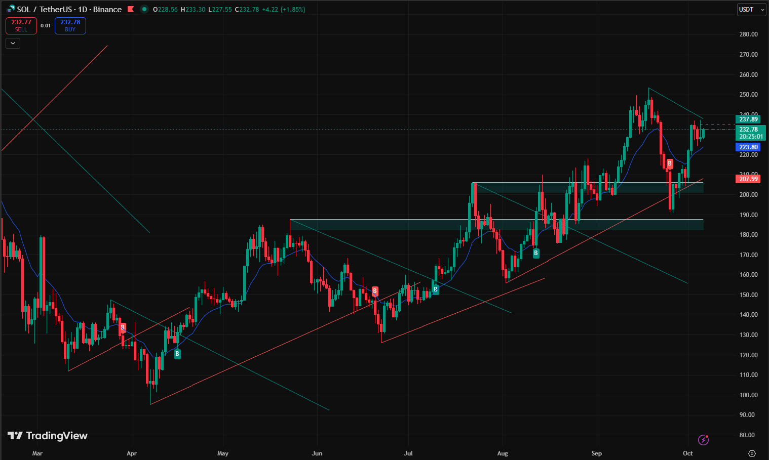 Solana (SOL/USDT on Binance, Image 6: Daily chart at $228.56 +1.85%, rising channel since March). SOL breaks $225 resistance, support at $215, buy at lows, RSI 62 strong, MACD bullish, Bands expanding. TVL $14B, users 1.1M.