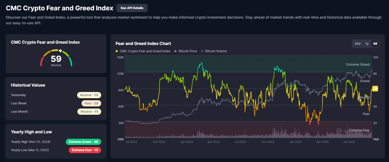 Trading volume averaged $187.87 billion daily, a 58% increase. The CMC Crypto Fear and Greed Index rose from 39 to 59, reflecting a shift from fear to confidence as liquidations dropped to $162 billion mid-week.