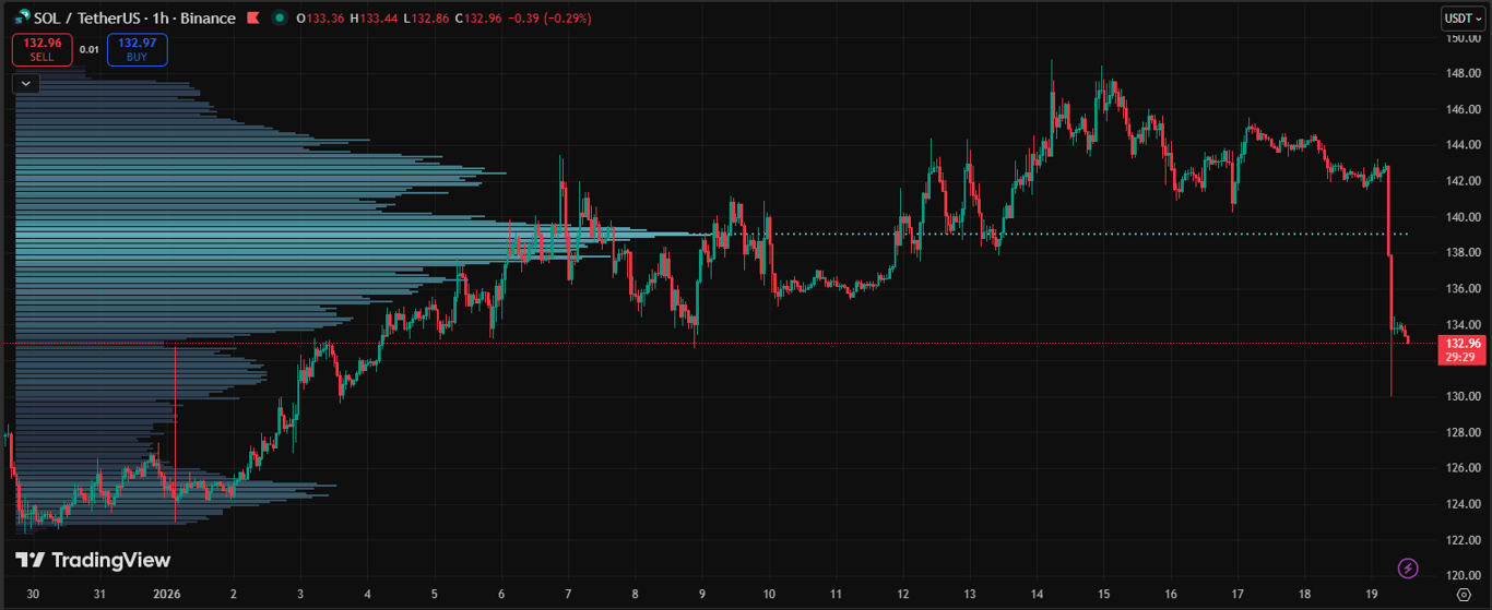 Solana trades near $132.96 on the 1-hour chart. Price pulls back after a test near $148. Broadly, SOL holds inside a range between $120 and $147.