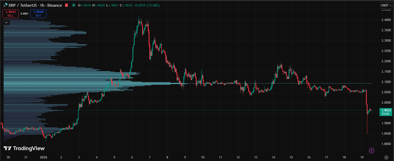 XRP trades near $1.9633 on the 1-hour chart. Price consolidates after a pullback from highs near $2.05. Broadly, the market holds inside a range between $1.90 and $2.05.