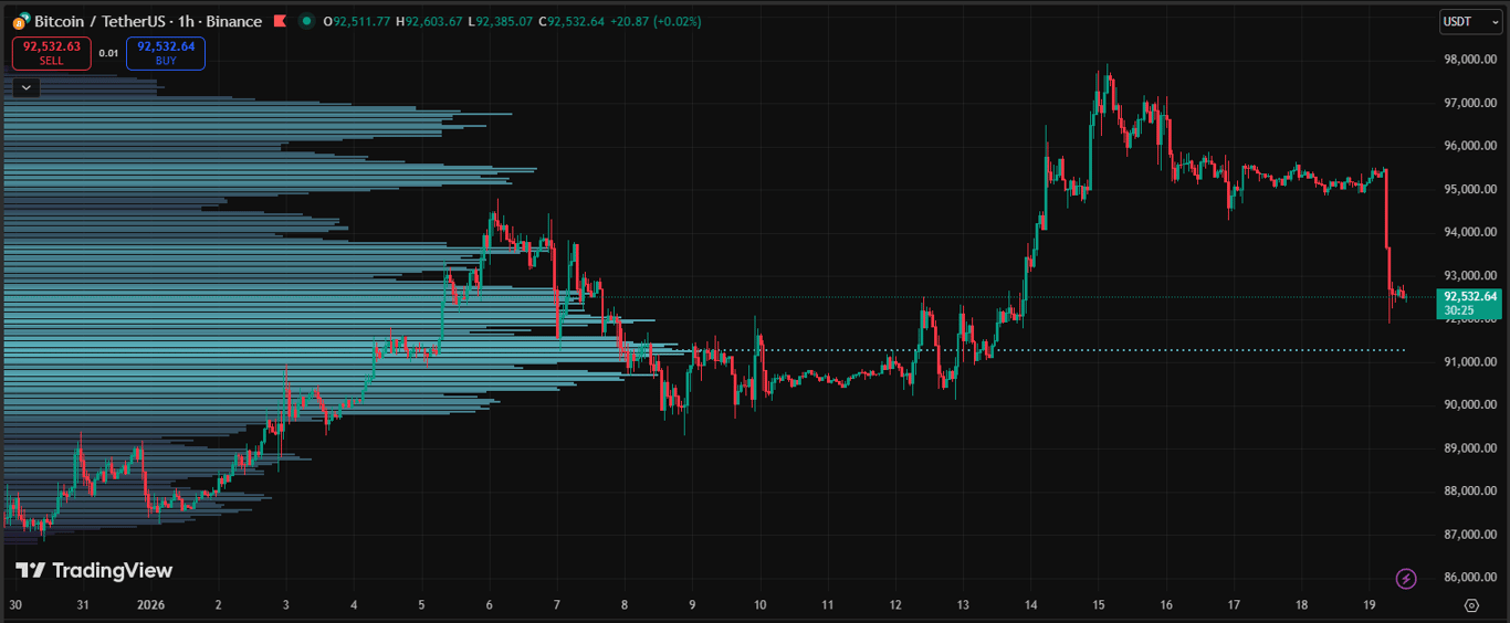 Recently, price printed higher lows since the swing low near $90,000, and the structure signals early accumulation. Still, the structure remains young, and confirmation requires follow through. Notably, volume profile shows dense activity between $90,000 and $92,500, and the node signals heavy participation plus active two-way trade.