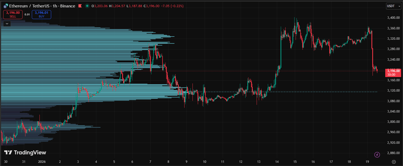 Ethereum trades near $3,196.00 on the 1-hour chart. Price consolidates after a pullback from highs near $3,360. Immediately, the $3,360 zone acts as resistance. Broadly, ETH holds inside a range between $2,880 and $3,400.