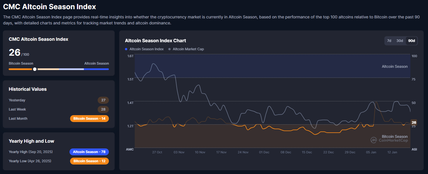 Image 3: The Altcoin Season Index read 26 out of 100 and signaled Bitcoin season. The index read 27 yesterday, and the index read 14 last week, and the index read 19 last month. The yearly high reached 78 in September 2025, and the yearly low reached 12 in April 2025. The 90 day trend showed a small rise, and the rise hinted at potential altcoin catch up.