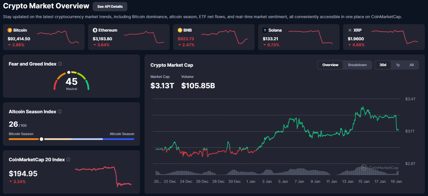 Image 1: CoinMarketCap shows total market cap near $3.13T and 24 hour volume near $105.85B. Major assets posted declines in the snapshot. Bitcoin traded near $92,414.50 and fell 2.86%. Ethereum traded near $3,193.80 and fell 3.64%. BNB traded near $923.73 and fell 2.47%. Solana traded near $133.21 and fell 6.73%. XRP traded near $1.9600 and fell 4.68%. The Fear and Greed Index read 45 and signaled neutral sentiment. The Altcoin Season Index read 26 and signaled Bitcoin season. The chart showed a dip from early January highs, and prices still held above December support zones.