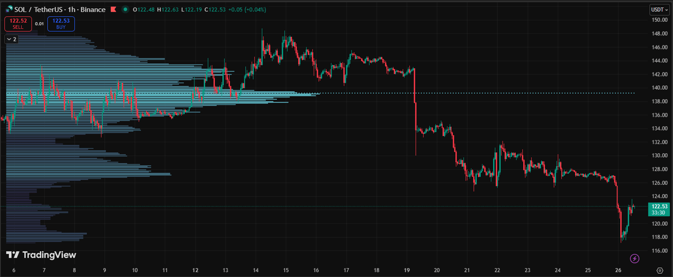 Trade plan: Maintain a neutral-to-bearish bias while price remains below the 50 EMA. Avoid chasing longs in this structure. A dip-buy only makes sense if SOL stabilizes around $118–$120, with a strict stop below $115, and a relief-rally target near $132.