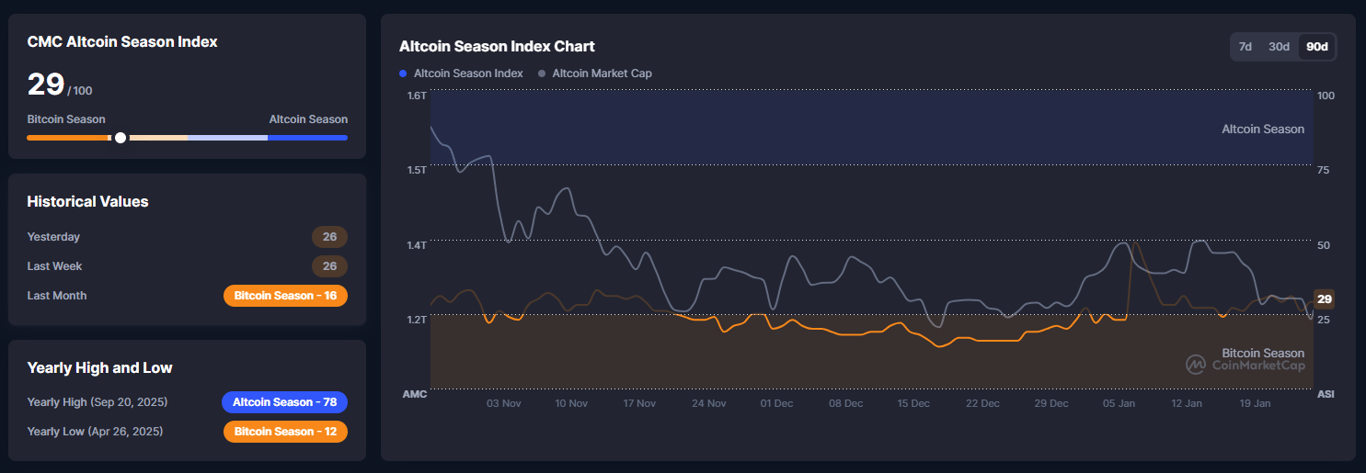 Image 3: The CMC Altcoin Season Index at 29/100 indicates "Bitcoin Season," with Bitcoin leading declines. Values: yesterday 26, last week 26, last month 16. Yearly high altcoin season 78 (Sep 2025), low Bitcoin season 12 (Apr 2025). The 90-day chart shows volatility but no major shift.