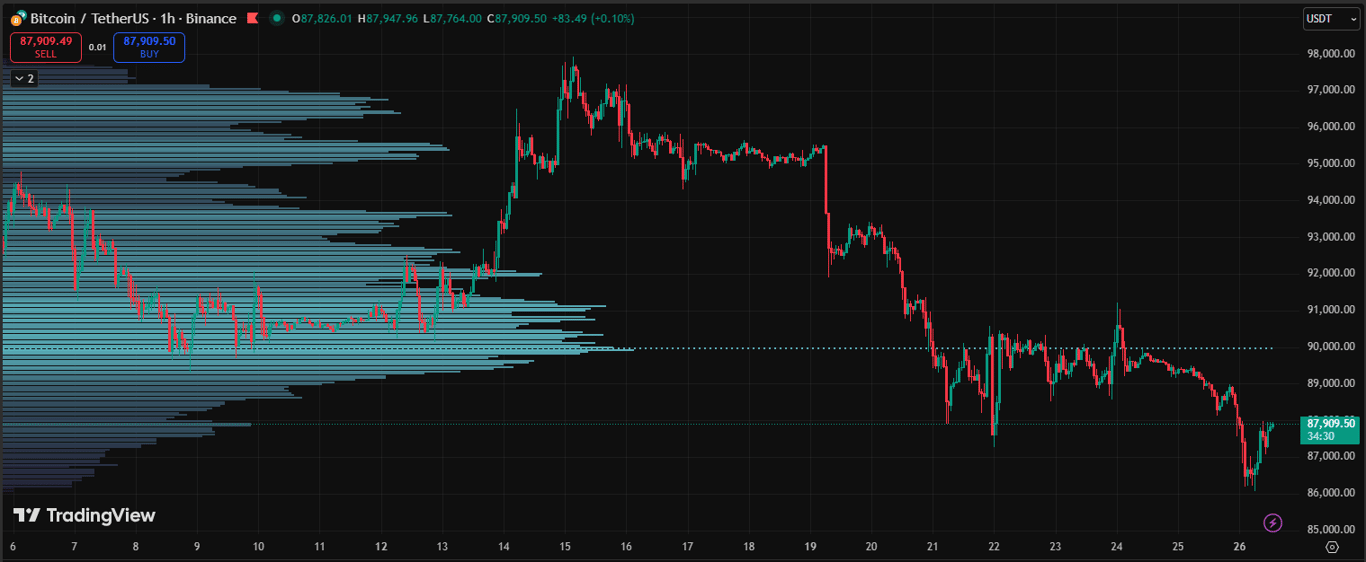 The BTC 1-hour chart still points to a bearish continuation. Price broke down from the $91,000 area and has printed lower highs and lower lows. Bitcoin is now testing local support around $87,000–$87,909, after dipping to a 2026 low near $86,007 earlier today. Selling pressure has cooled compared with the prior leg down, and RSI (14) is back near 50.31, which signals neutral momentum, but the trend remains fragile. Both the 50 EMA (~$88,434) and 200 EMA (~$90,182) are sloping down, and price is still trading below both, so these levels act as dynamic resistance and keep the medium-term bias bearish.