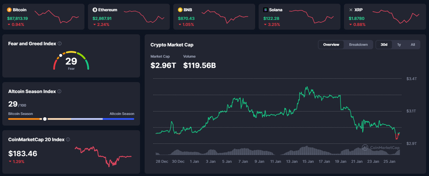 Crypto markets pulled back during Jan 19–26, 2026 as geopolitical tension and hotter inflation data pushed investors into risk-off mode. Bitcoin fell below $88K, total market cap slid to ~$2.96T, and sentiment weakened with Fear & Greed at 29 while the Altcoin Season Index stayed at 29 (Bitcoin season). Major coins followed the drop, and 1-hour charts for BTC, ETH, SOL, and XRP still showed bearish structure with key EMAs acting as resistance despite RSI stabilizing. Macro uncertainty and upcoming policy catalysts kept volatility elevated, but institutional activity stayed constructive through ETF flows, bank approvals, and continued corporate accumulation, supporting a cautious “sell rallies / wait for confirmation” stance while watching key support and breakout levels.