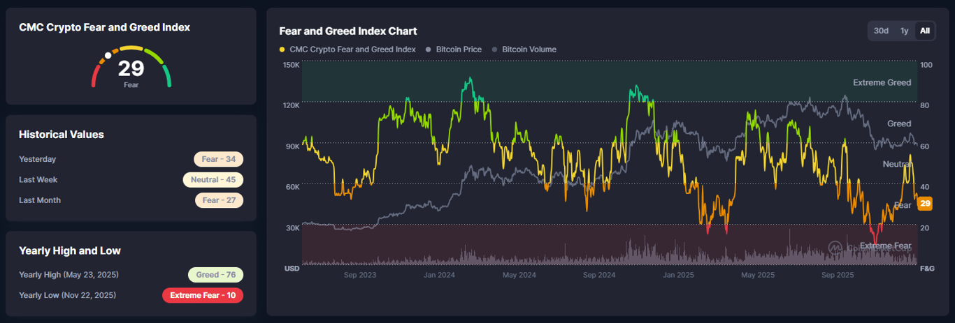 Sentiment indicators also weaken. The Fear and Greed Index drops to 29, placing the market in fear territory. The Altcoin Season Index sits at 29, reinforcing a Bitcoin-led market environment rather than broad altcoin strength.
