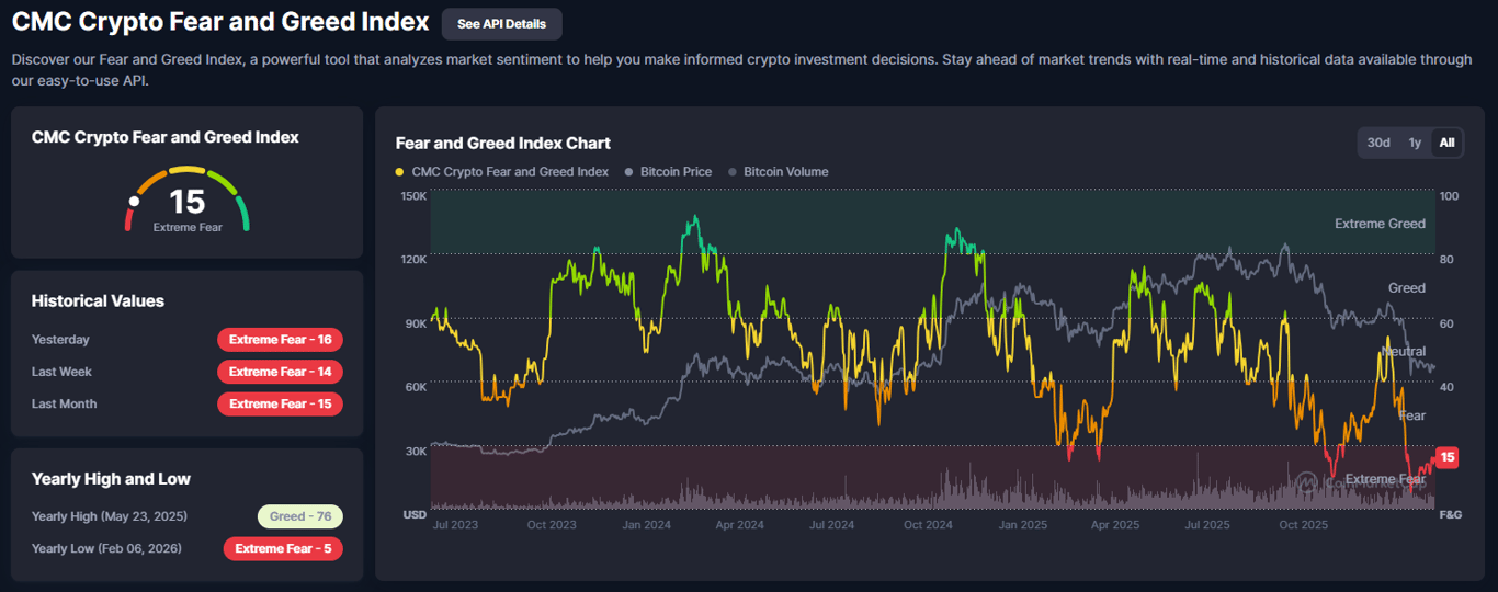 Image 2: The CMC Crypto Fear and Greed Index remains at 15 (Extreme Fear), with values: yesterday 16, last week 14, last month 15. Yearly high greed 76 (May 2025), low extreme fear 5 (Feb 6, 2026). The chart shows sentiment stuck in deep fear.