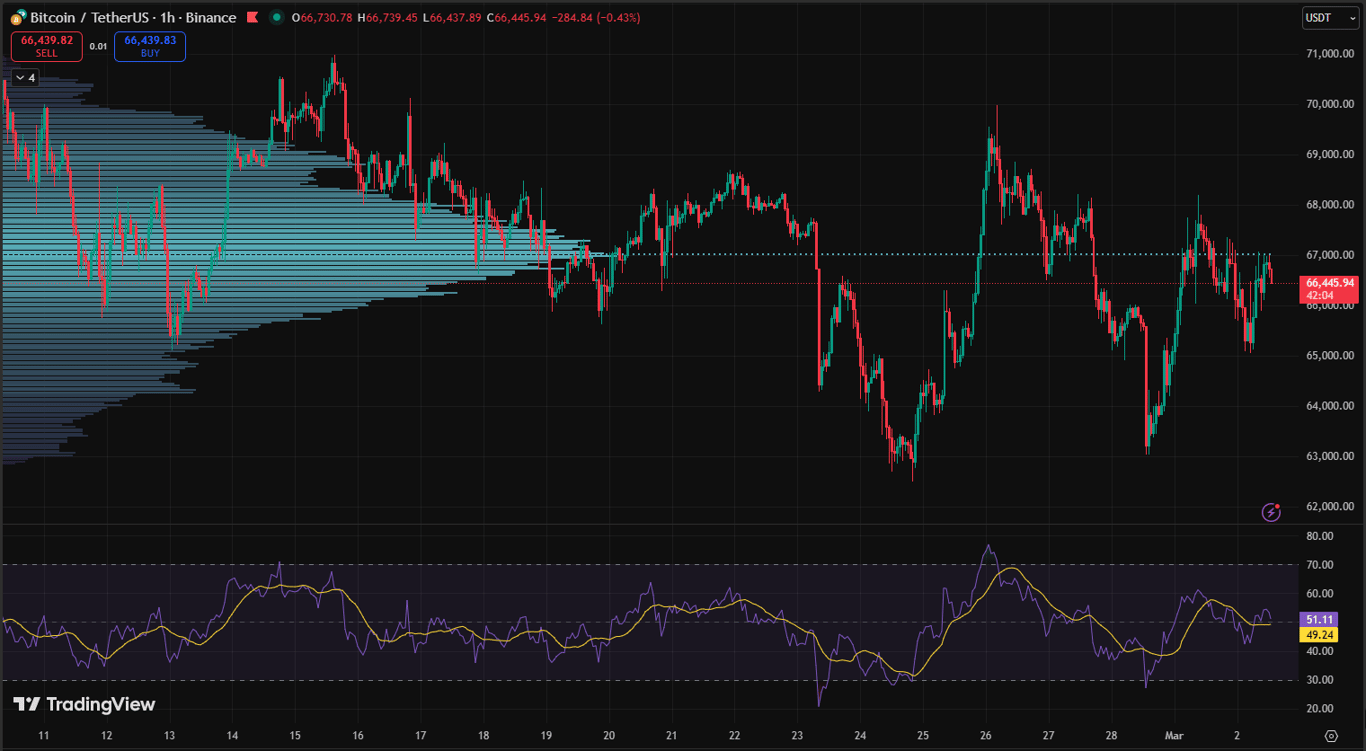 - Volume Profile: Strong resistance is established at $68,000 (previous POC), while immediate support is being defended at $66,400.