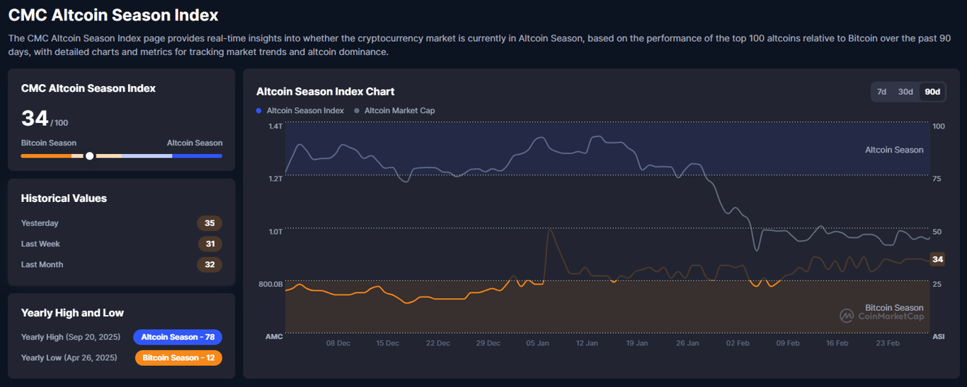 Image 3: The CMC Altcoin Season Index at 34/100 (Bitcoin Season), slight rise: yesterday 35, last week 31, last month 32. Yearly high altcoin season 78 (Sep 2025), low Bitcoin season 12 (Apr 2025).