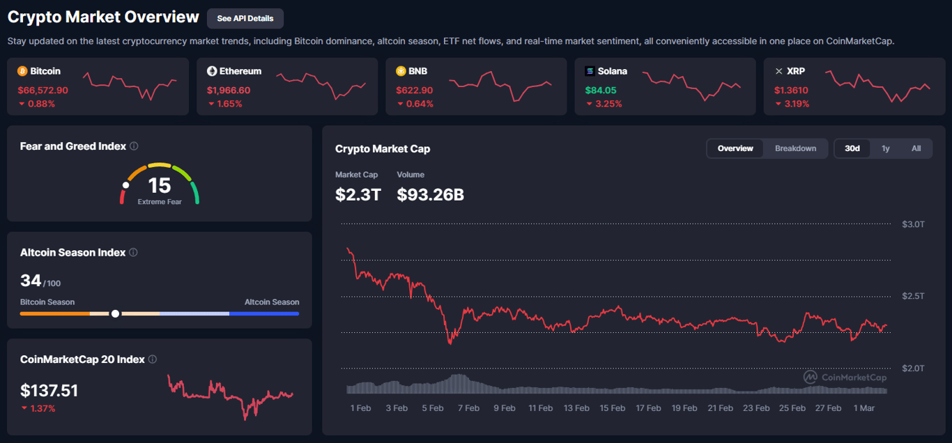 Image 1: The Crypto Market Overview dashboard from CoinMarketCap illustrates the continued downtrend, with total market cap at $2.3T and volume $93.26B. Top coins remain red: Bitcoin at $66,572.90 (down 0.88%), Ethereum at $1,966.60 (down 1.65%), BNB at $622.90 (down 0.64%), Solana at $84.05 (down 3.25%), XRP at $1.3610 (down 3.19%). Fear and Greed Index at 15 (Extreme Fear), Altcoin Season Index 34 (Bitcoin Season), CoinMarketCap 20 Index $137.51 (down 1.37%). The chart shows a multi-week descending channel, with the latest extension into early March.