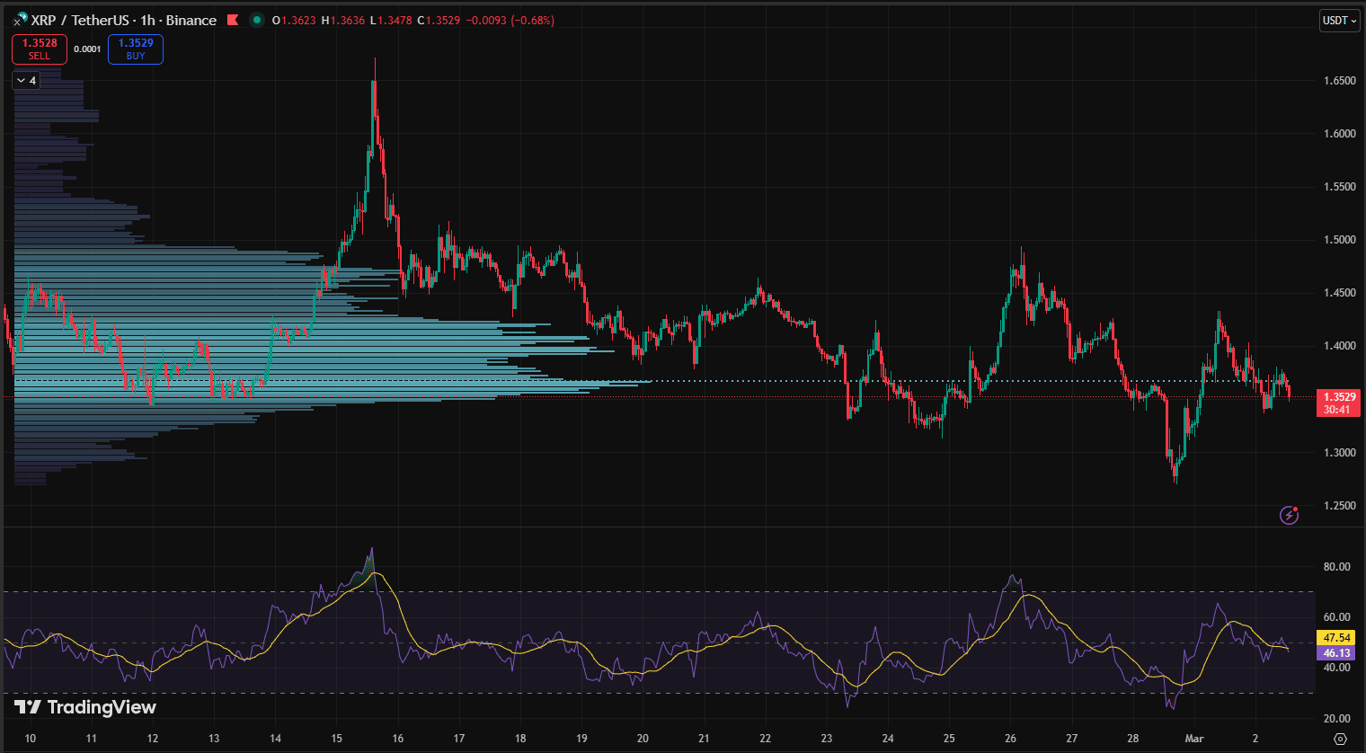 - Volume Profile: Strong resistance is established at the $1.39–$1.42 cluster, while the next major liquidity floor sits at $1.35–$1.37.