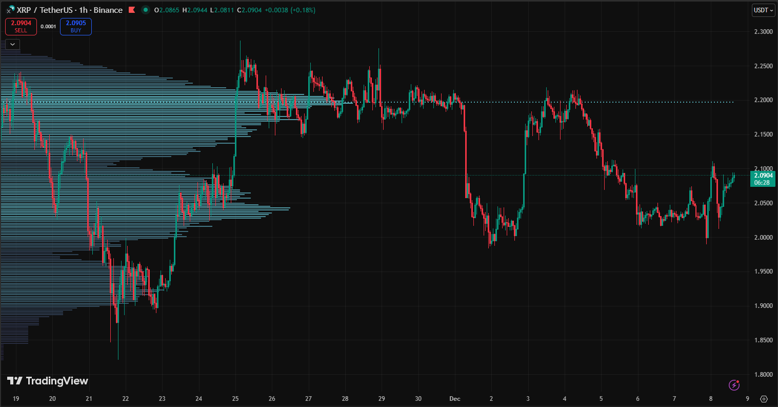 XRP has been forming higher lows since $2.0157, a sign of early accumulation, but the structure is still fragile. Volume stacks between $2.03 and $2.21, an area where large players step in but where older positions also unwind. Price sits under both the 50-period and 200-period moving averages on the 1 hour chart. Both are sloping lower, which keeps downside pressure intact. RSI sits near 43, steady but not signaling a shift. Bollinger Bands stay wide and volatility remains elevated. Buying volume is thin and sellers still control most of the heavy moves.